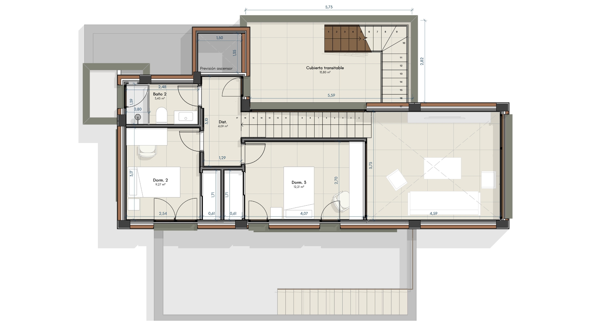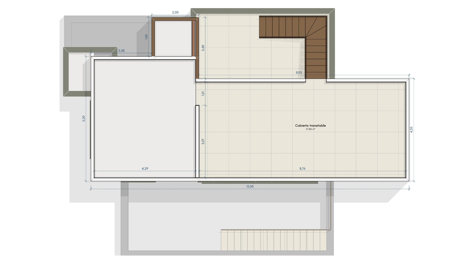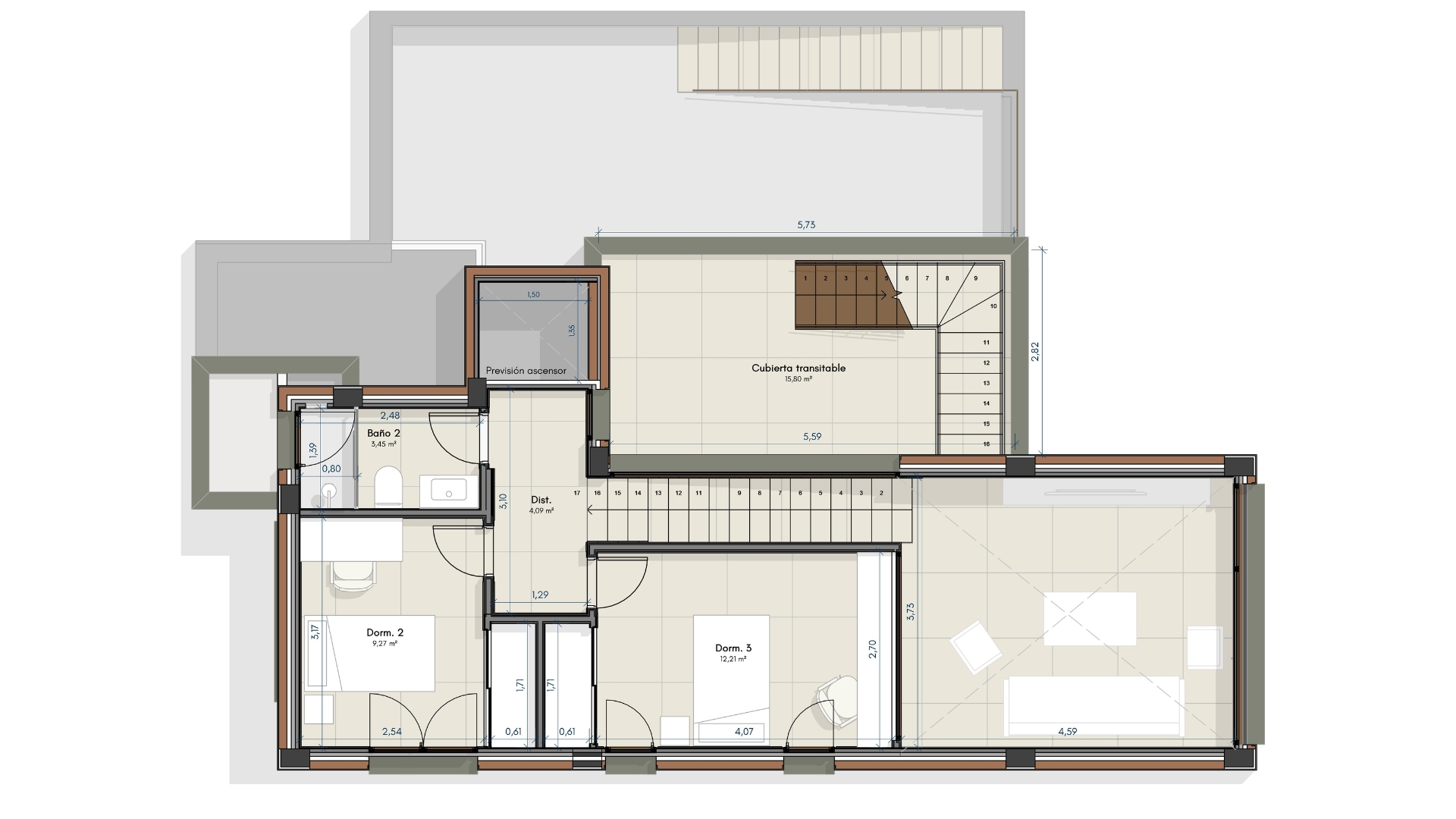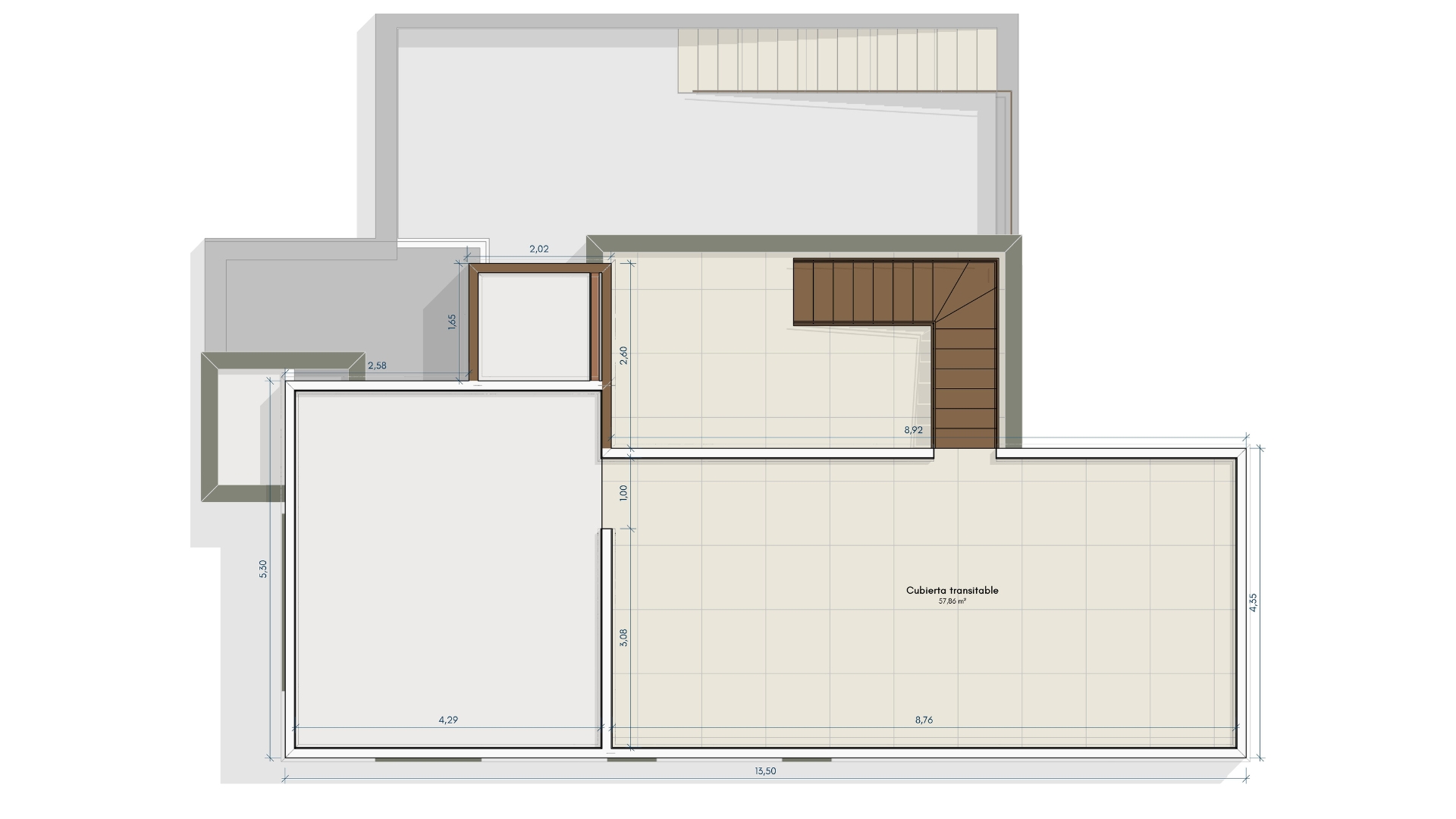 Cada vivienda dispone de solarium privado en la cubierta de la vivienda al cual se accede mediante escalera metálica con acabado en acero corten.