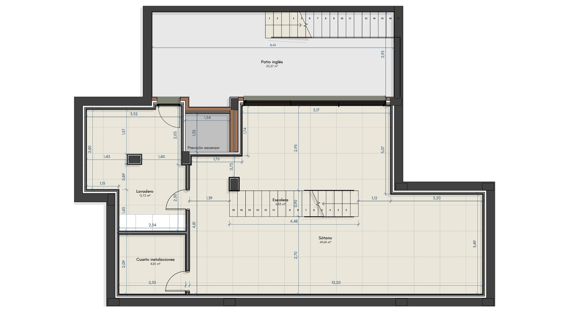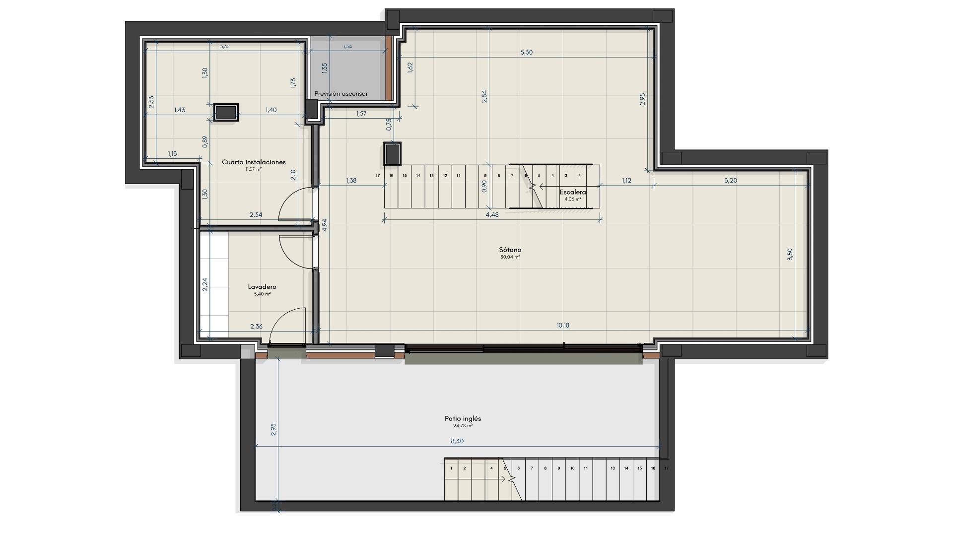 Todas las viviendas están dotadas de patio inglés con acceso independiente desde el exterior, mediante escalera quebrada de hormigón revestida con gres porcelánico antideslizante de gran formato. Barandilla metálica acabado acero corten.